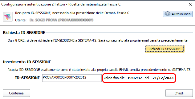 La durata della validità dell'ID-SESSIONE è indicata alla destra del campo:
