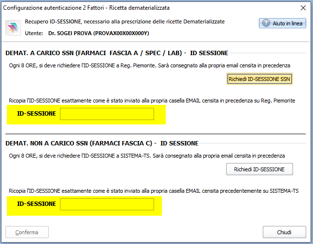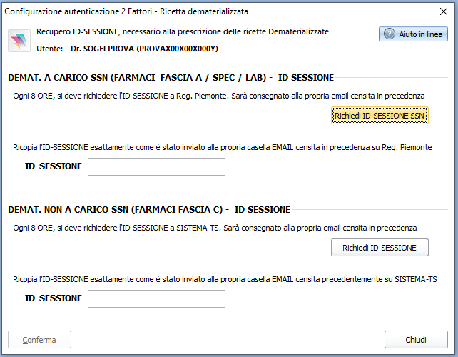 La schermata è suddivida in due parti: la parte in alto permette la richiesta dell'ID-Sessione per le ricette in fascia A (SSN); la parte inferiore permette la richiesta dell'ID-Sessione per le ricette di fascia C.